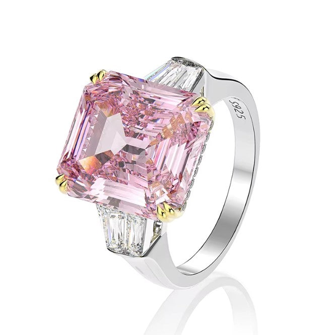 Genevieve 16x14mm pink emerald 17ct cubic zirconia on 925 sterling silver enagement ring.A 16x14mm emerald cut on a brilliant yellow canary cubic zirconia set on 925...