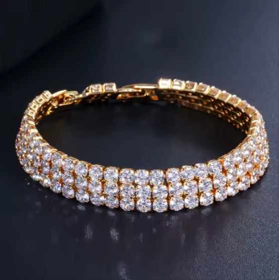 Regular price $ 42.95Sale price $ 42.95 Regular priceUnit price / perKim three rows 3.9mm round cubic zirconia silver or gold tennis bracelet. Classic tennis bracelet, 3.9mm round cubic zirconia hand set on a three row design with...