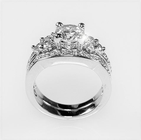 This wedding and egagement style is created with a 1.4ct round center stone and trio of smaller stones adoring each side, and array of cz accents on both rings.