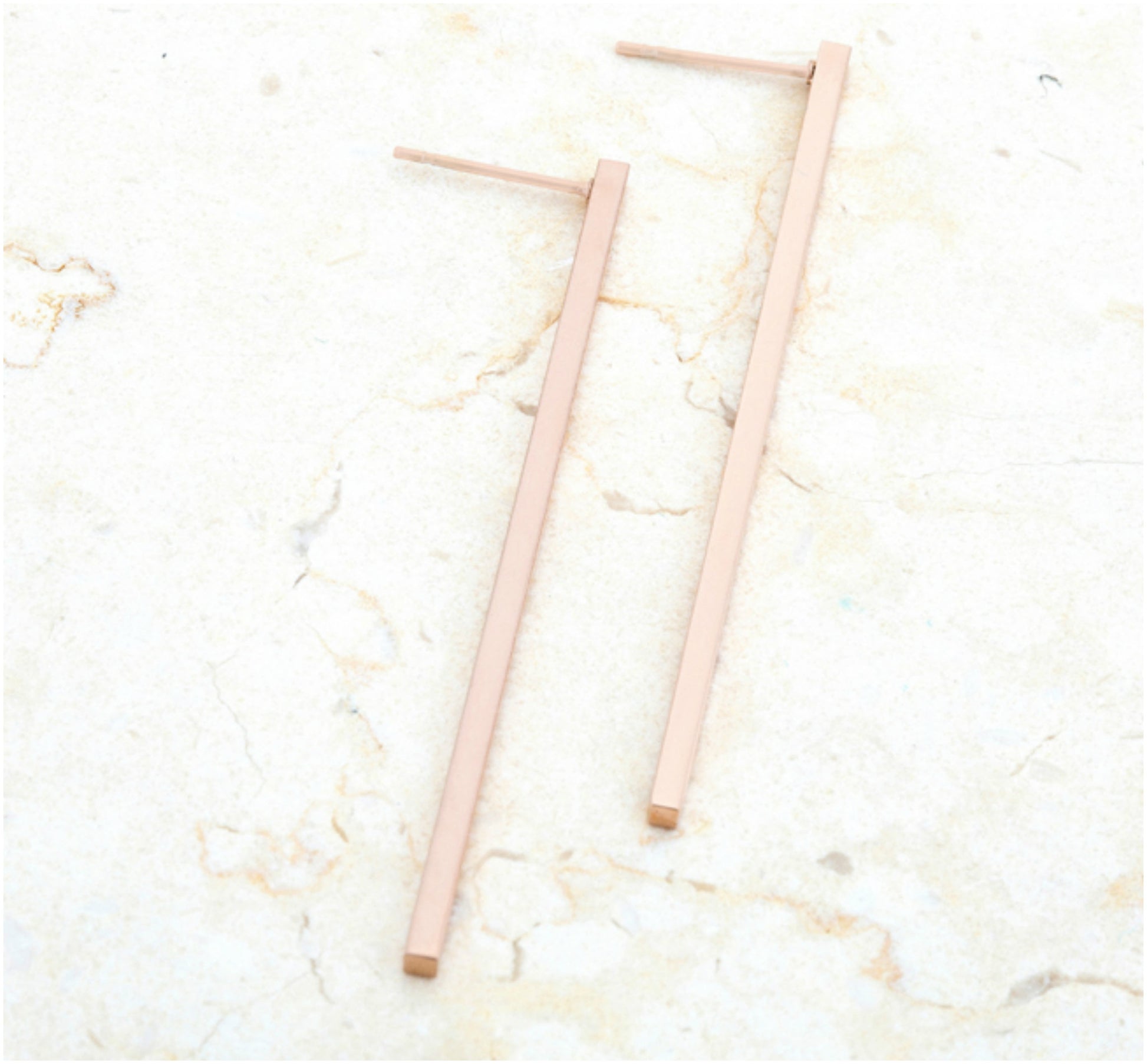 A simple, long line minimal design linear earrings in rose goldtone or silvertone. The perfect piece to elevate your look.