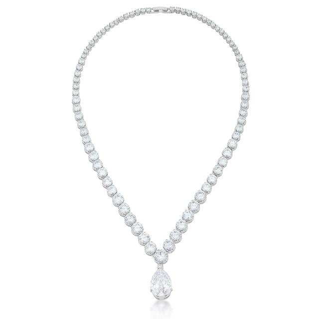 Adopt a piece of glamour with this elegant necklace with glistening various size round and 19x13mm pear cut cubic zirconia set on a silvertone rhodium finish.