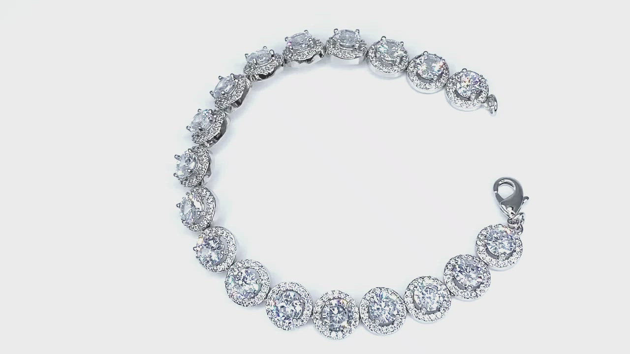 An classic elegant halo bracelet features glistening round cubic zirconia prong set on silvertone rhodium finish with lobster clasp closure.