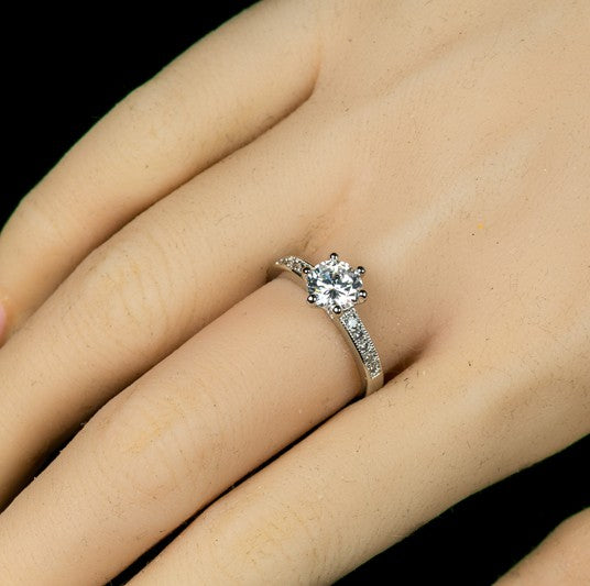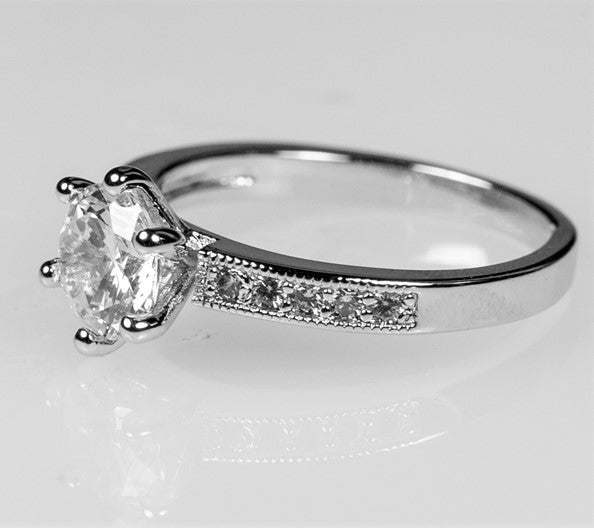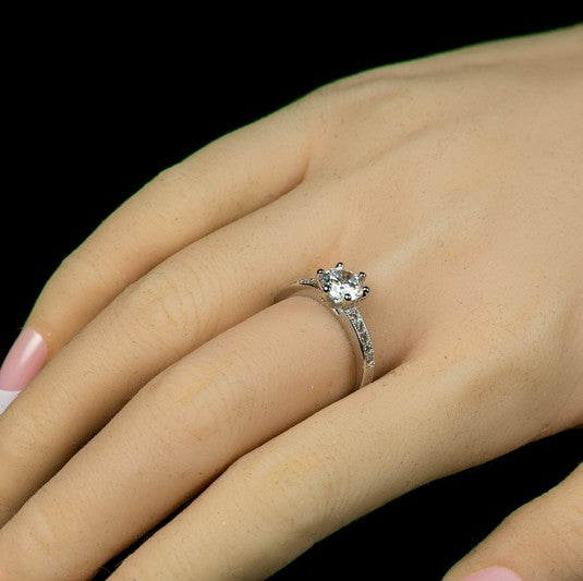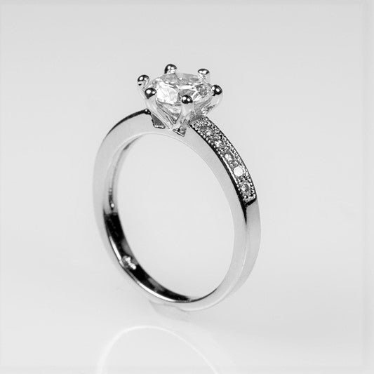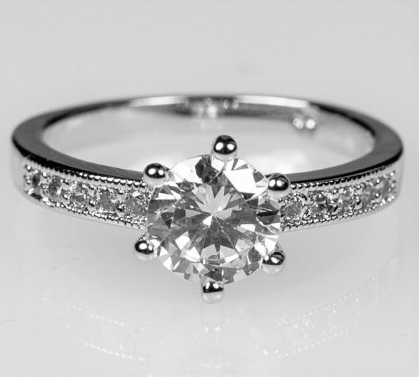 An exquisite engement ring that will enhance all waredrobe with a 1ct round cubic zirconia center stone and channel set cz on both shoulders on a silvertone plated finish.
