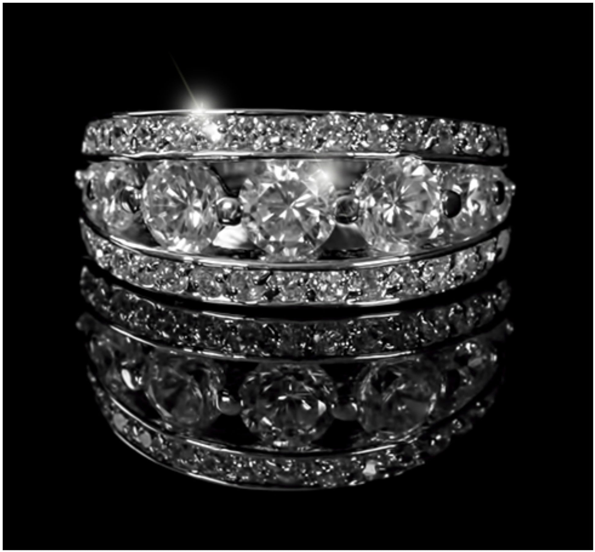 This seven stone band style is created with channel set round cubic zirconia on silver rhodium polished int a lustrous silvertone finish. The tiered Ring features seven impressive cubic zirconia in an anniversary style set across the top face, with pave cubic zirconia lining.