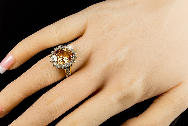 5.5 carat royal sapphire blue or citrine champagne oval cut halo mounted on a crown of pave clear cz with lustrous paved engagement engagement ring. This is the finest replica of Kate Middleton's royal engagement ring you can find.