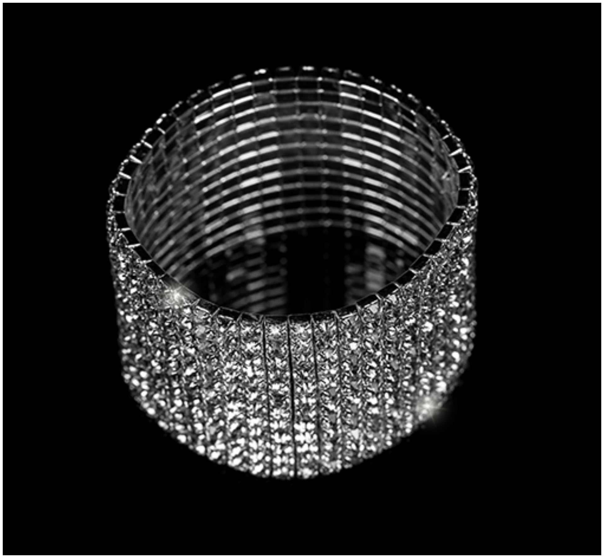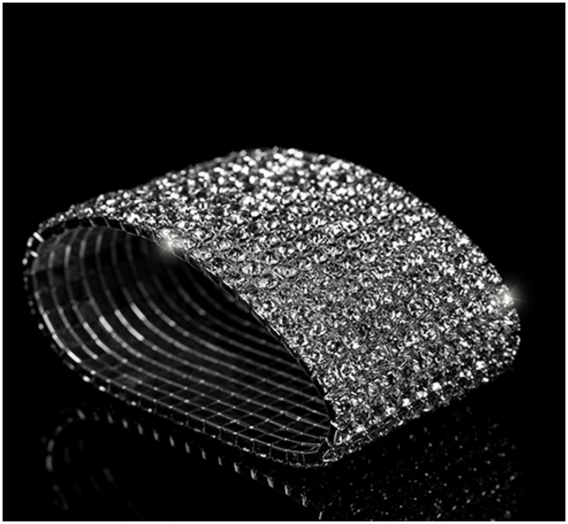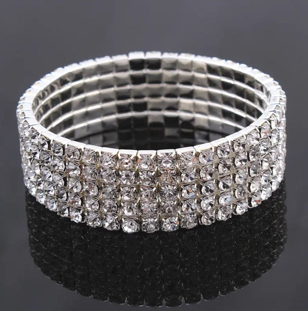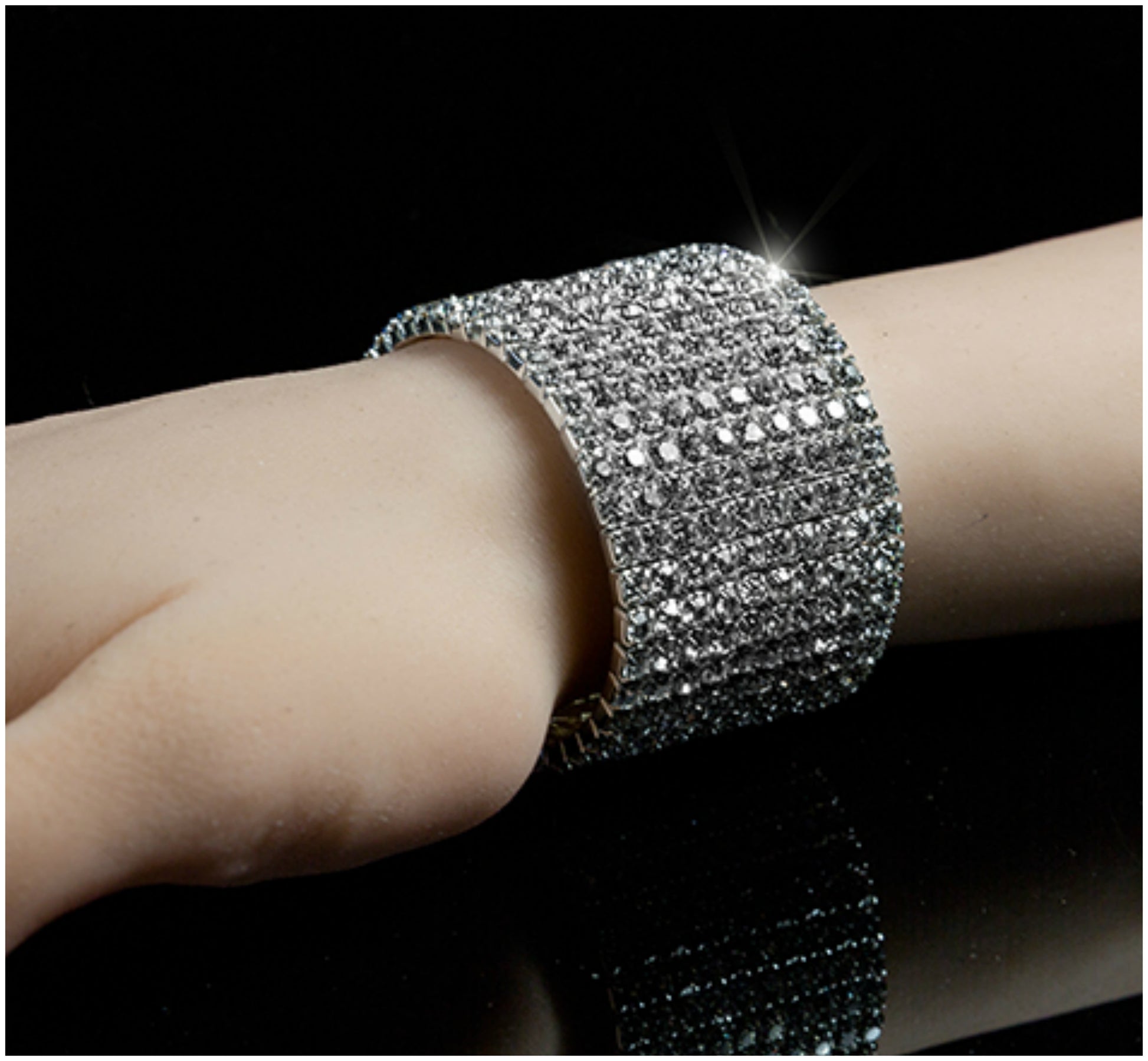This is a Stretchable Bangle Bracelet is created with ten rows quality sparkling Rhinestone and Rhodium Finish. It will give a perfect complement for the Bridal Party. The Stretch ability of this piece Creates a Perfect Form to Fit on your wrist.