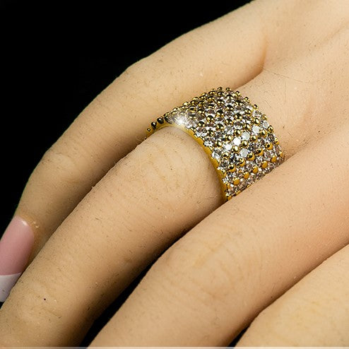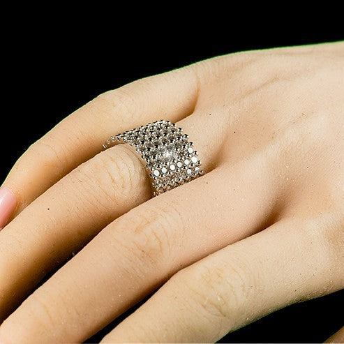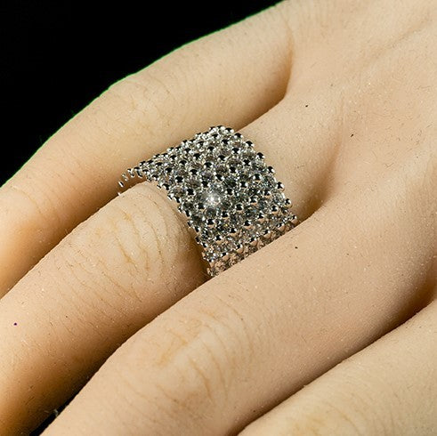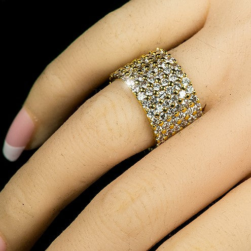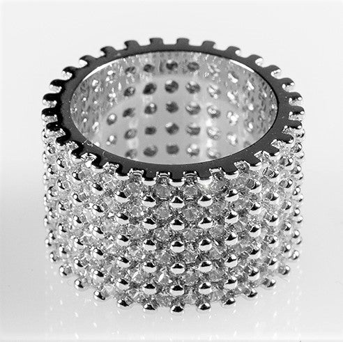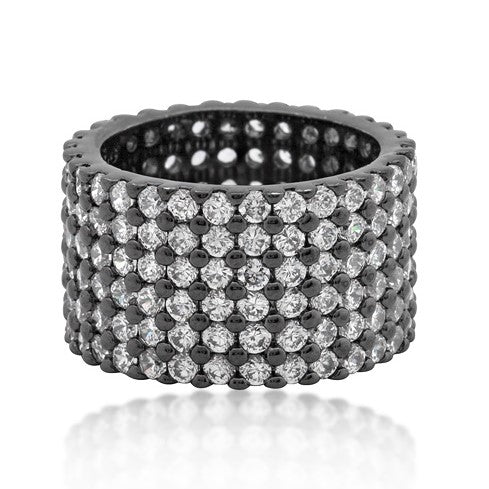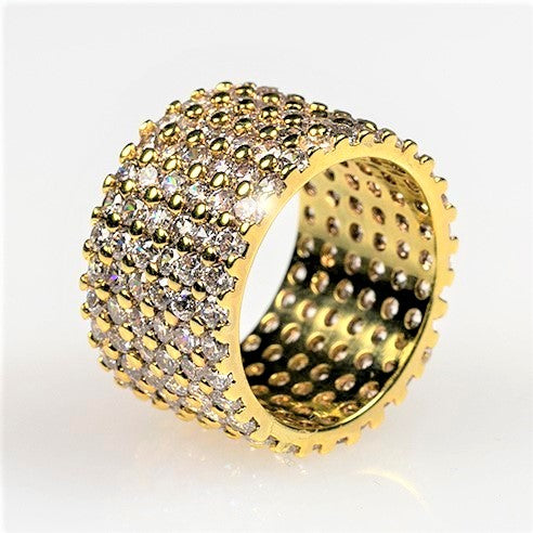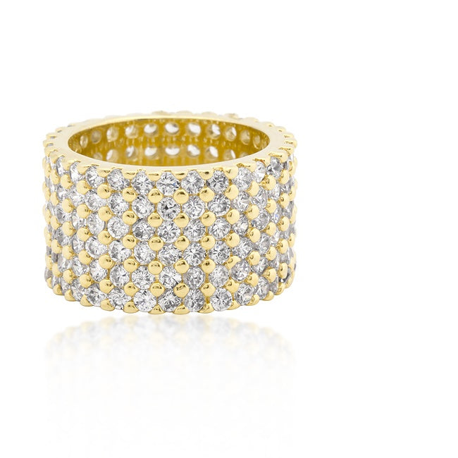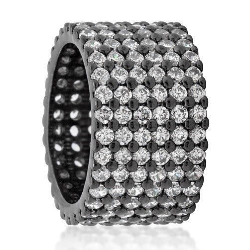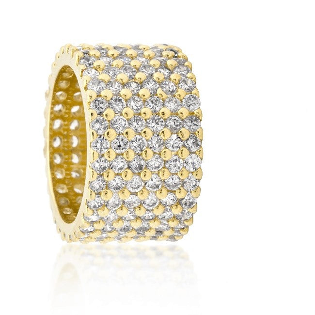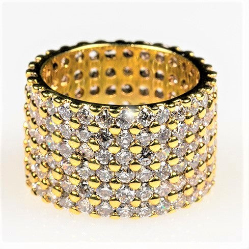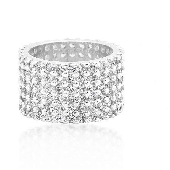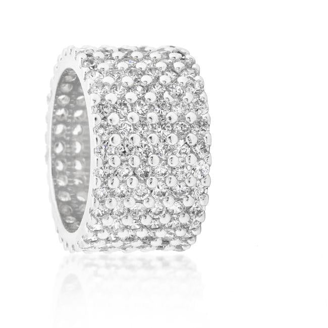 This glamorous pave wide band ring features rows of sparkling 1mm clear round 22 carat cubic zirconia.